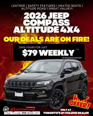 April is the perfect time to save at Raceway, your local dealership proudly serving Toronto, Etobicoke, Mississauga, and Brampton. For a limited time, we’re offering exclusive April specials on new Jeep Wrangler, Jeep Compass, Jeep Grand Cherokee, Ram 1500, and Dodge Durango models. Whether you’re looking for a spring-ready SUV, a powerful pickup truck, or a versatile family vehicle, Raceway has aggressive pricing and month-end incentives designed for GTA drivers.